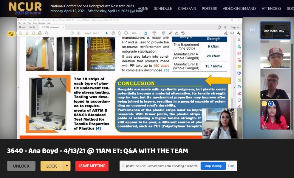 El grupo conformado por Ana Isabel Boyd, Dariana Martínez, Orlando Leyva y Mónica Flores, asesorados por el Dr. Francisco Grajales, presentaron los aspectos más relevantes de la investigación realizada. El objetivo de este proyecto fue evaluar la viabilidad de reutilizar plástico procedente de botellas para la fabricación de ‘geomallas’ de refuerzo con propiedades adecuadas para su implementación en carreteras rurales no pavimentadas.