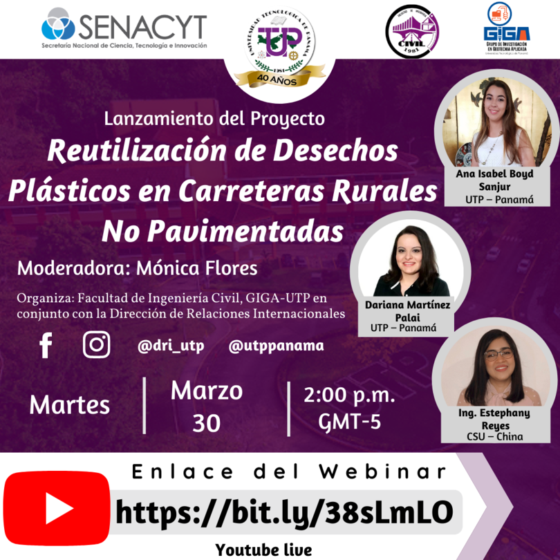 Estudiantes de la Universidad Tecnológica de Panamá y miembros del grupo GIGA, realizaron el día 1 de febrero de 2023 un conversatorio de cierre del proyecto “Reutilización de desechos plásticos en carreteras rurales no pavimentadas”, que fue beneficiado por la Convocatoria Pública de Nuevos Investigadores 2019 Ronda II de la Senacyt.