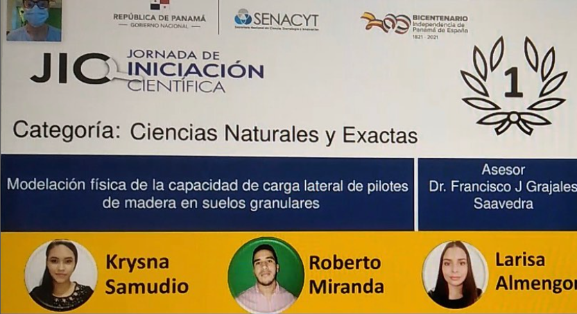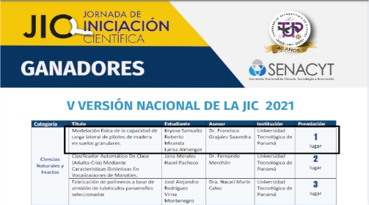 Dentro de los participantes concursaron, en la categoría de ciencias naturales y exactas, miembros del Grupo de Investigación en Geotecnia Aplicada, los estudiantes: Krysna Samudio, Roberto Miranda y Larisa Almengor, asesorados por el Dr. Francisco Grajales, quienes obtuvieron el primer lugar en su categoría con el proyecto titulado: “Modelación física de la capacidad de carga lateral de pilotes de madera en suelos granulares”.